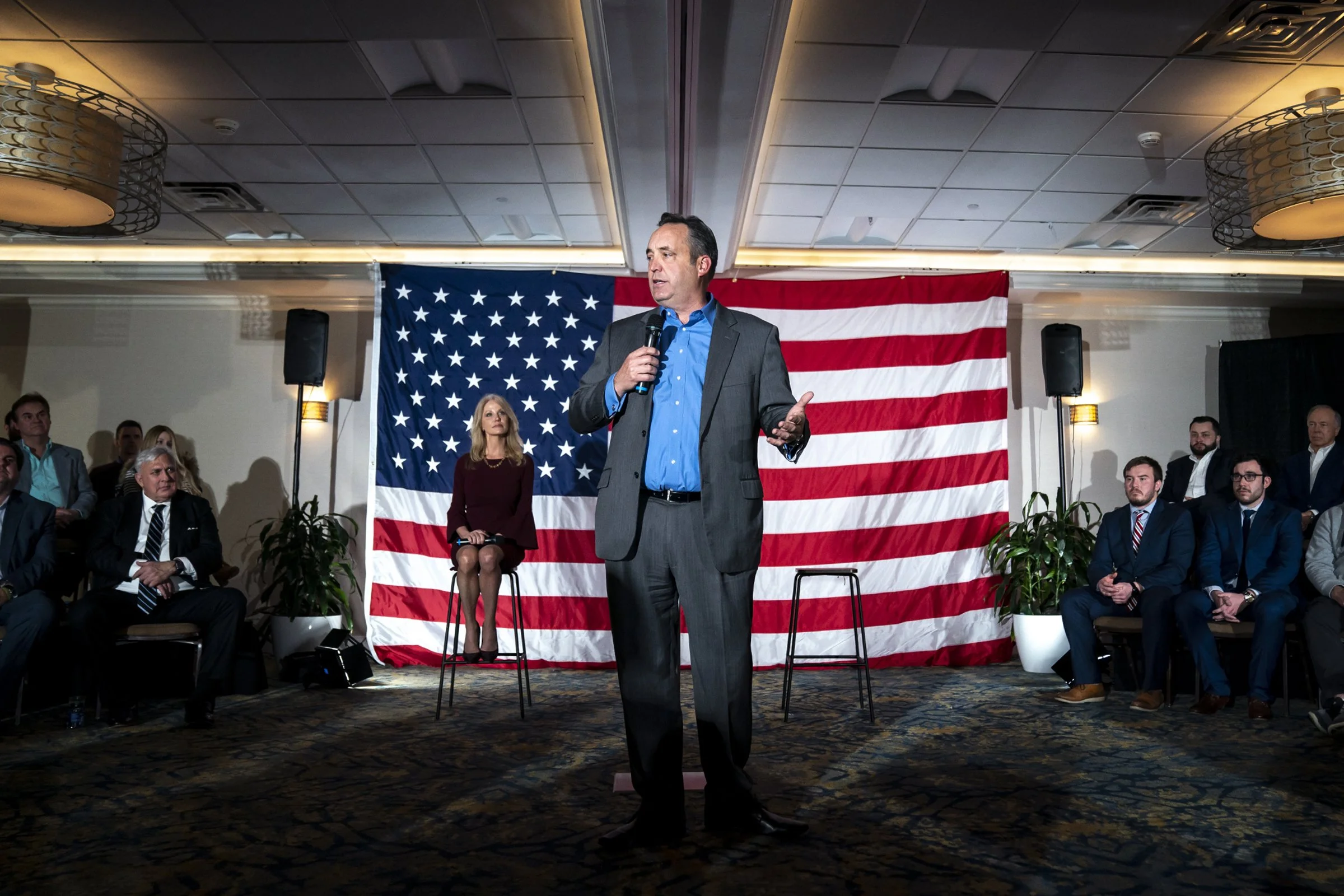 Campaign pollster and advisor Kellyanne Conway looks on as Sen. Jake Corman, Republican candidate for governor, speaks during a town hall event, Monday, Feb. 28, 2022, at Crowne Plaza Suites Pittsburgh South in Bethel Park.