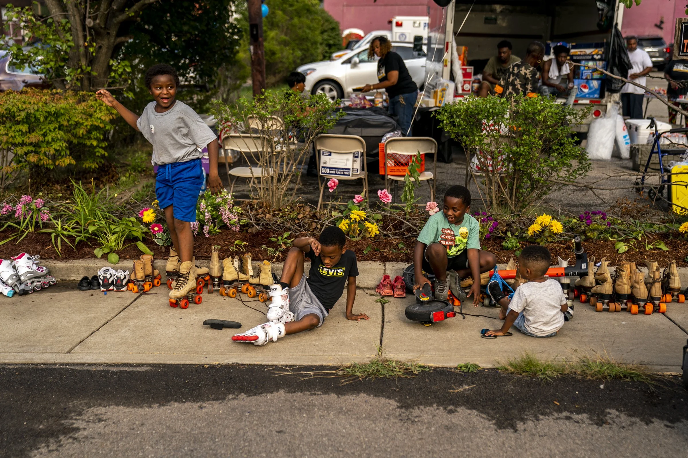 Kids put on roller skates at the National Night Out event organized by Buy Back The Block, Tuesday, August 2, 2022, on Frankstown Avenue in Homewood. National Night Out is a nationwide community-building effort that aims to strengthen communities and their partnerships with police and public safety officials.