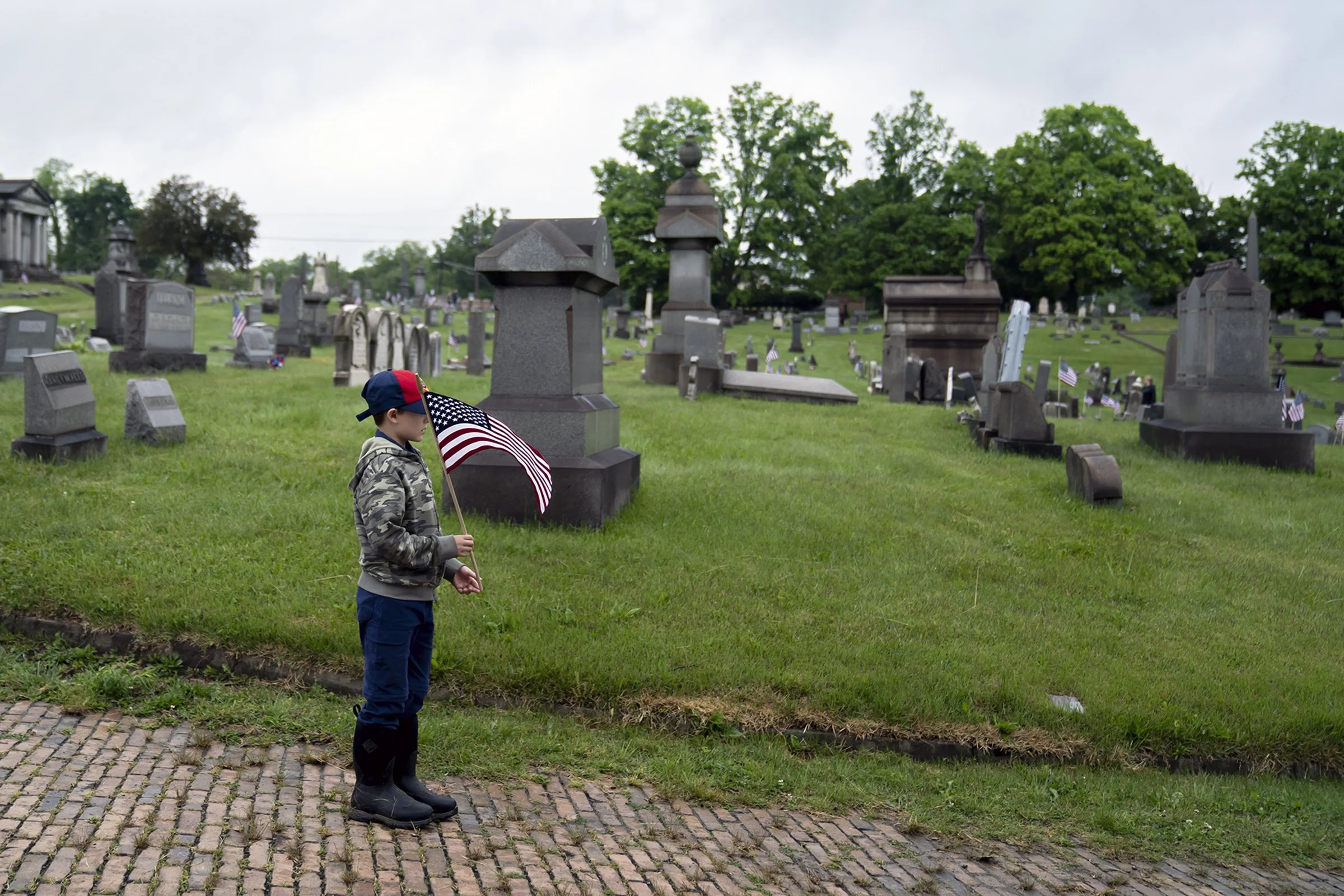A member of Harrison-based Cub Scout Pack 186 holds a flag during an event to place hundreds of American flags at the graves of veterans at Prospect Cemetery in Brackenridge in honor of Memorial Day, Saturday, May 28, 2022.