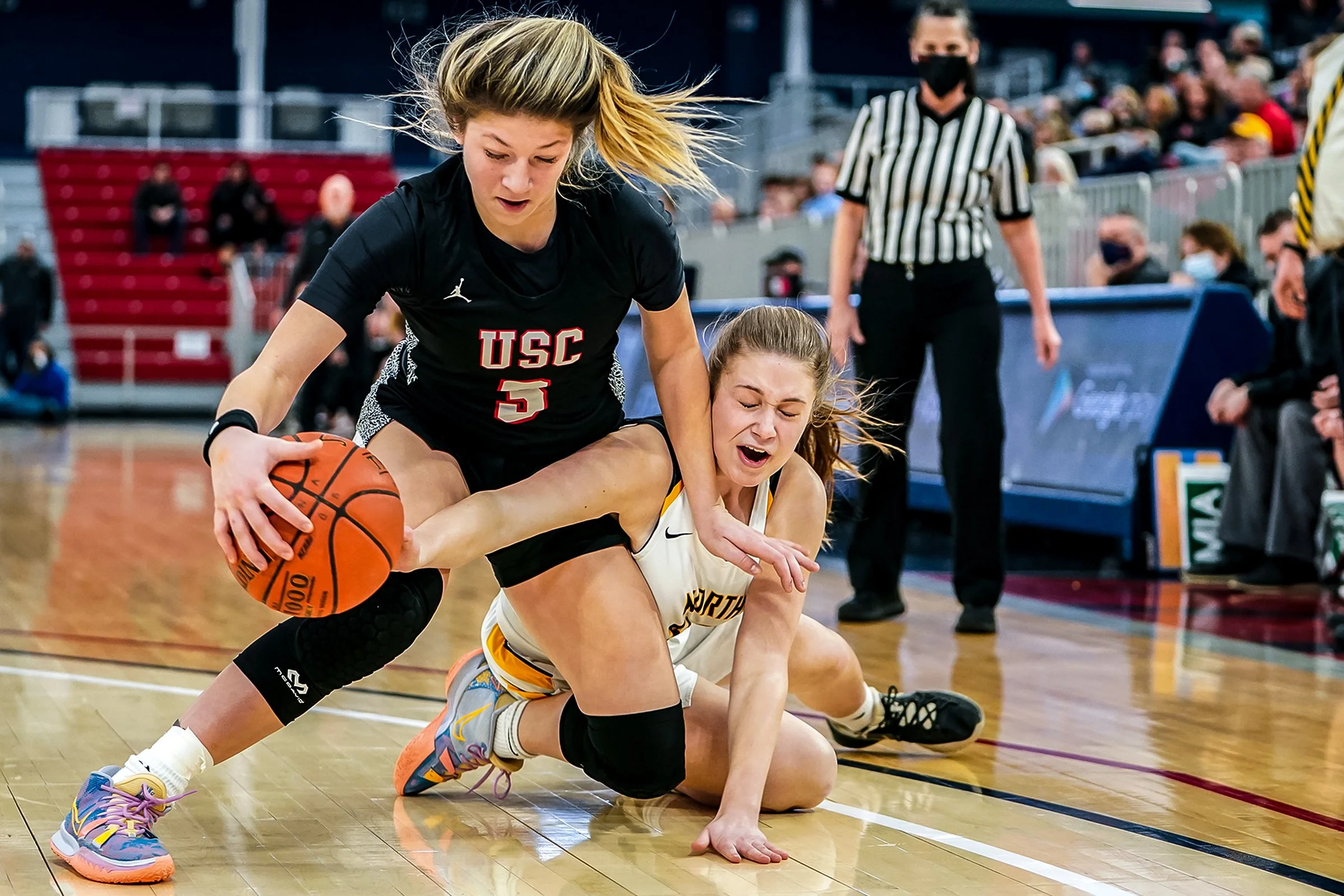 Upper St. Clair’s Rylee Kalocay (3) and North Allegheny’s Caroline Henderson (10) fight for possession of the ball during their WPIAL Class 6A semifinal game, Saturday, Feb. 26, 2022, at Robert Morris University’s UPMC Events Center in Moon. Upper St. Clair defeated North Allegheny 48-44.