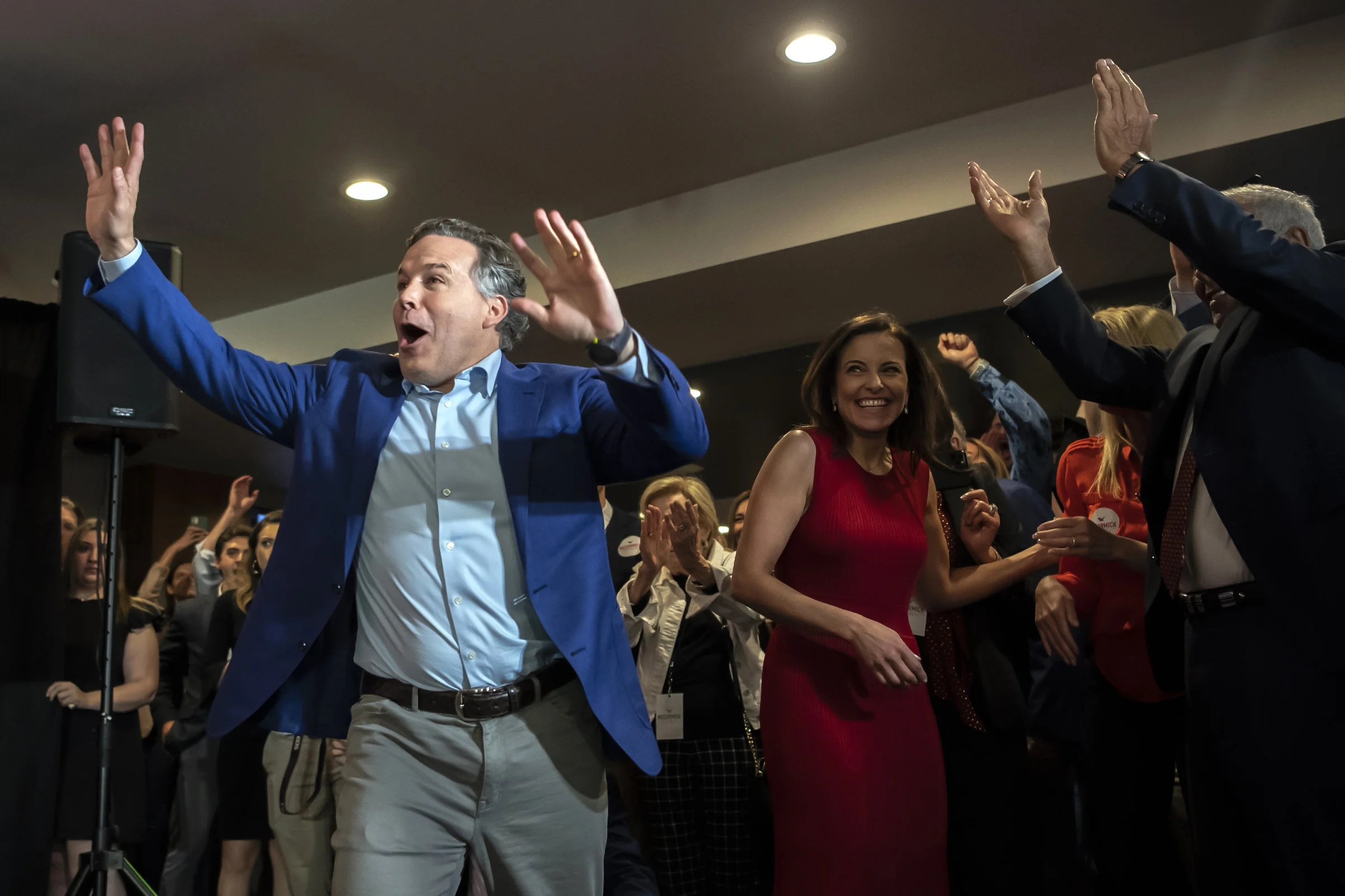 Republican U.S. Senate candidate David McCormick and his wife Dina Powell greet supporters at his primary election night event, Tuesday, May 17, 2022, at Hotel Indigo in East Liberty.