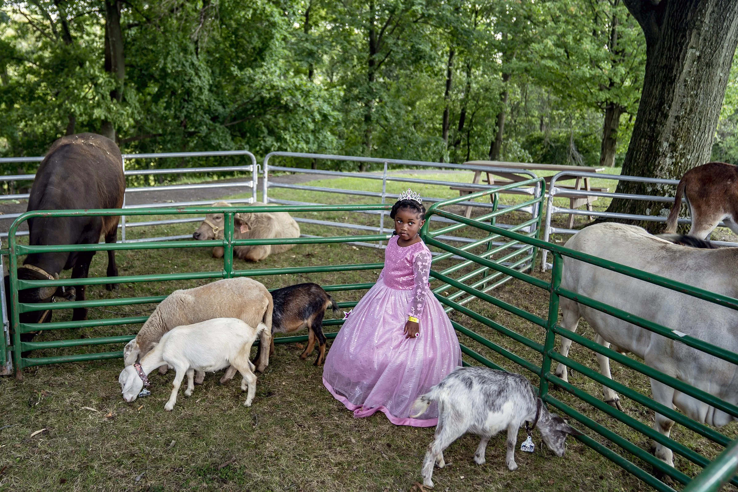 Viyhleea Jammer, 4, of McKees Rocks, stands amongst goats in the “royal petting zoo” in her princess costume during the Fairytale Festival, an annual fundraising event for the Gemini Children's Theater, Sunday, September 18, 2022, in Riverview Park in Perry North.