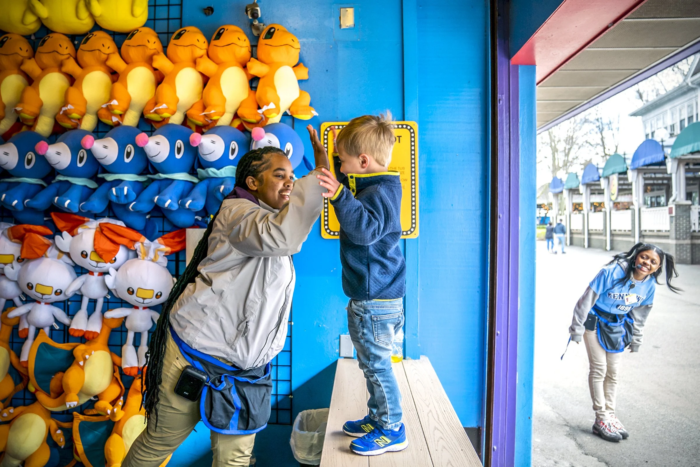 Kennywood employee Jaida Redman, of West Mifflin, high-fives Harrison Glick, 3, of Squirrel Hill, after he had success playing a carnival game at Kennywood on the first day the park was open to all guests for the season, Sunday, April 17, 2022, in West Mifflin.