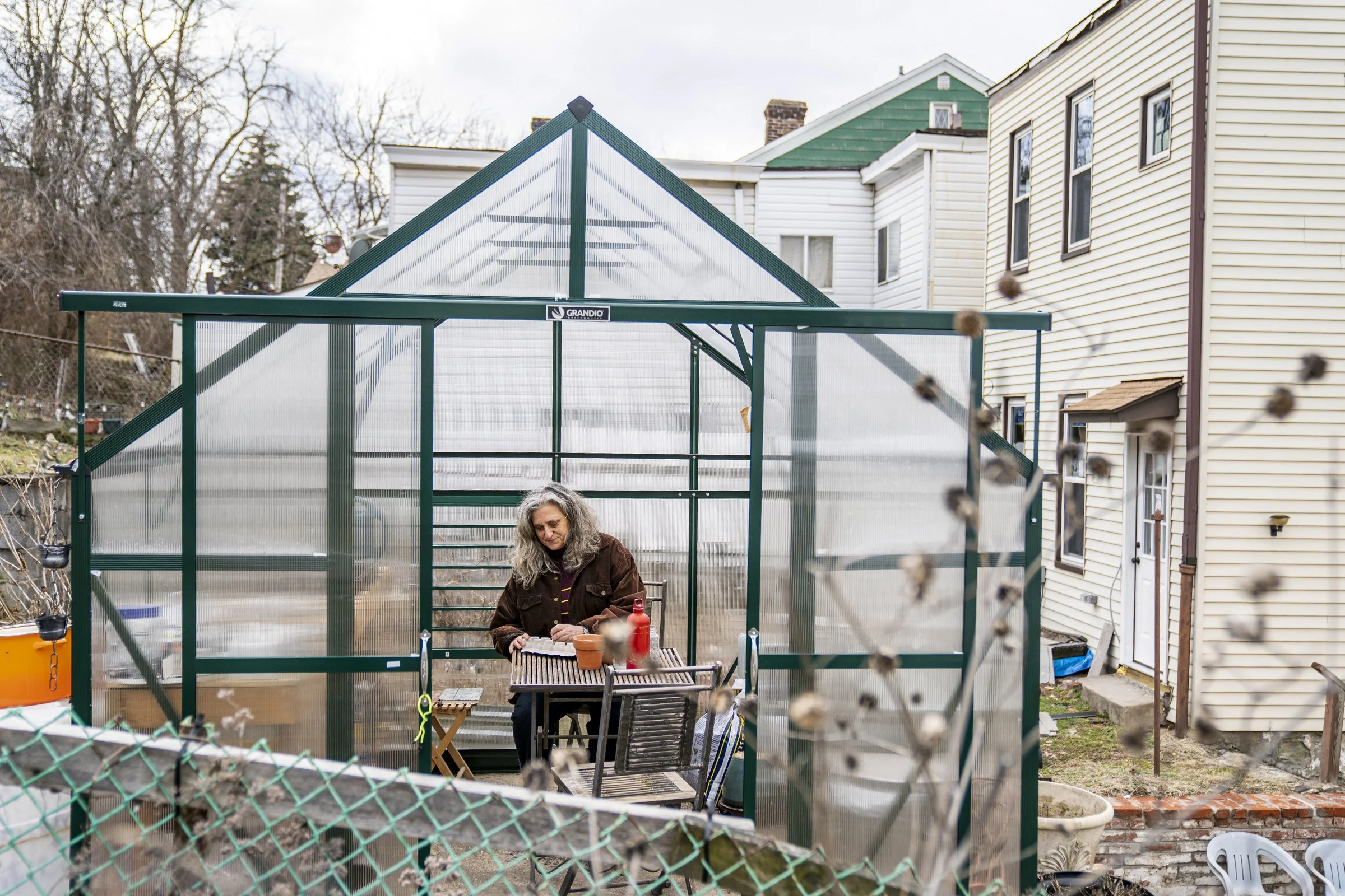 Sherrie Flick pokes drainage holes in egg crates used to start seeds in her greenhouse in her urban backyard garden, Tuesday, March 8, 2022, on the South Side Flats.